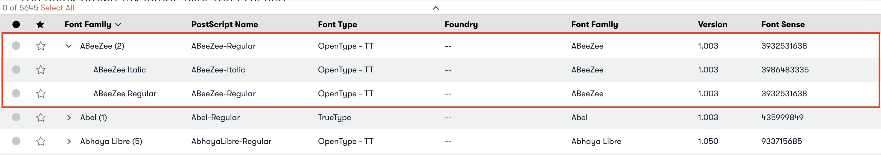 Dies führt dazu, dass die Schriften in der Spalte "Schriftfamilie" gruppiert werden: