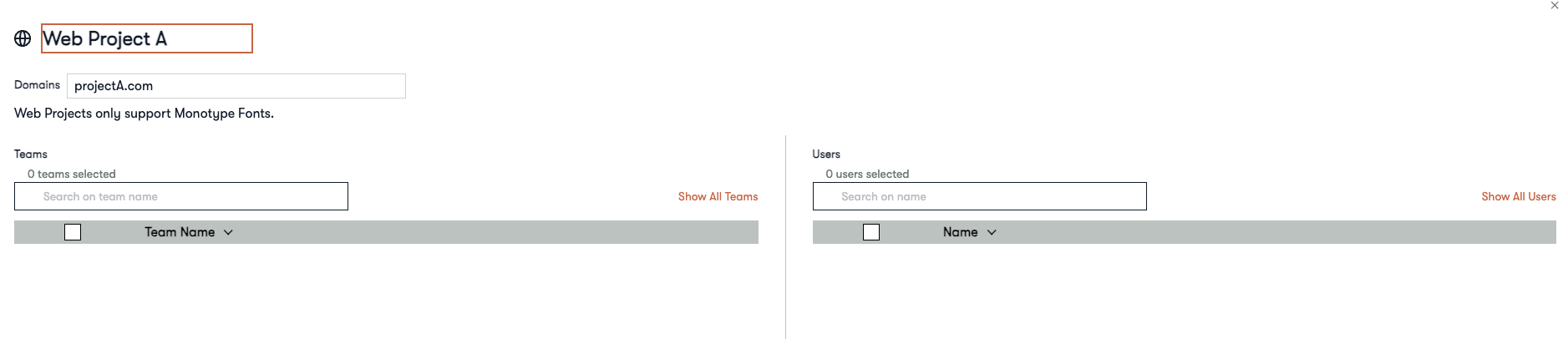 Provide a name for your web project, add an associated domain (optional but helps you keep track of the project), and assign individuals or teams access to the project