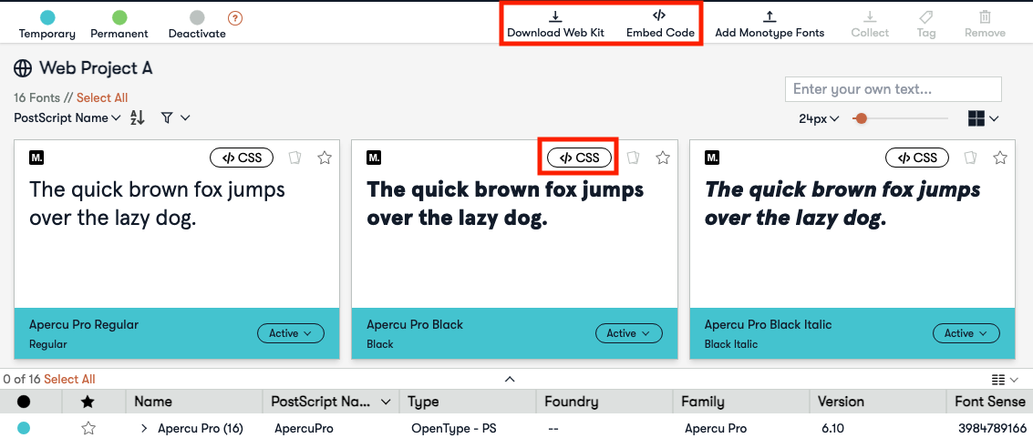 You can add fonts from the Monotype library directly to the web project like you would any library (see Monotype Font Inventory)