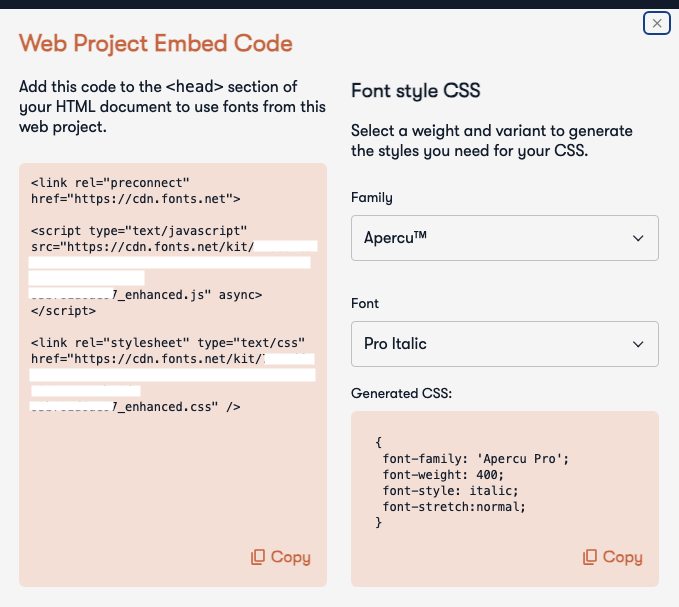 You can download a full webkit for fonts added to the web project, as well as pull up embedded CSS code